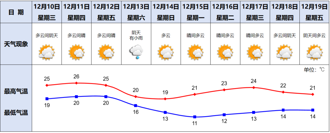12月10日,多云间阴天,19~25℃,相对湿度55%~80%;11日,多云间晴,20~26℃;12日,多云间晴,20~25℃。(荔湾区气象台12月9日17时发布)